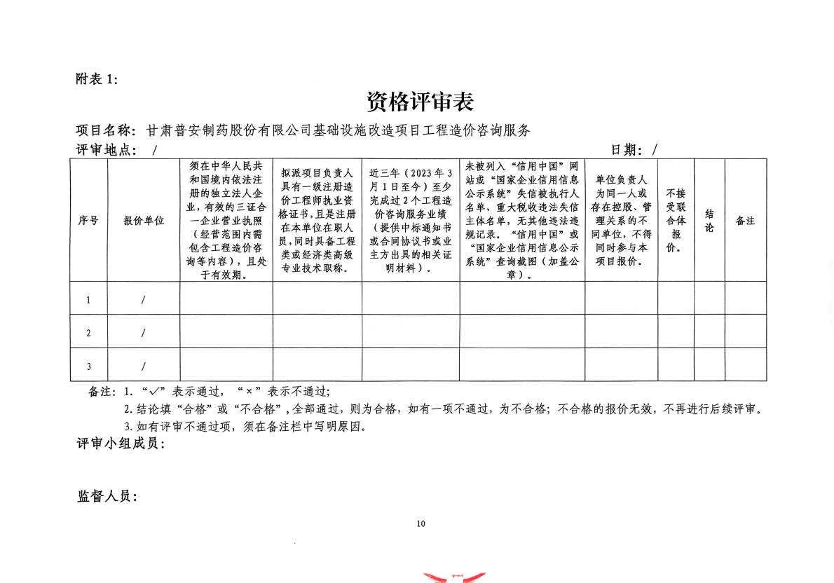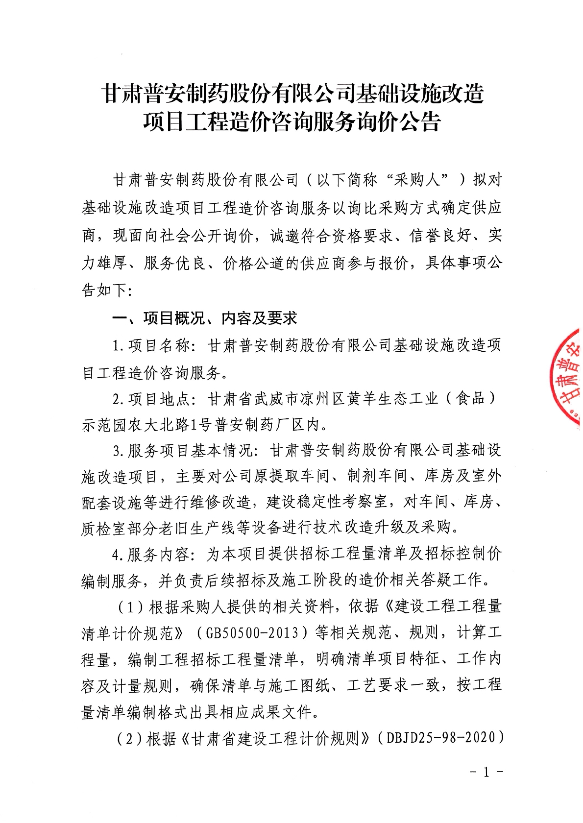 甘肅普安制藥股份有限公司基礎(chǔ)設(shè)施改造項(xiàng)目工程造價(jià)咨詢服務(wù)詢價(jià)公告