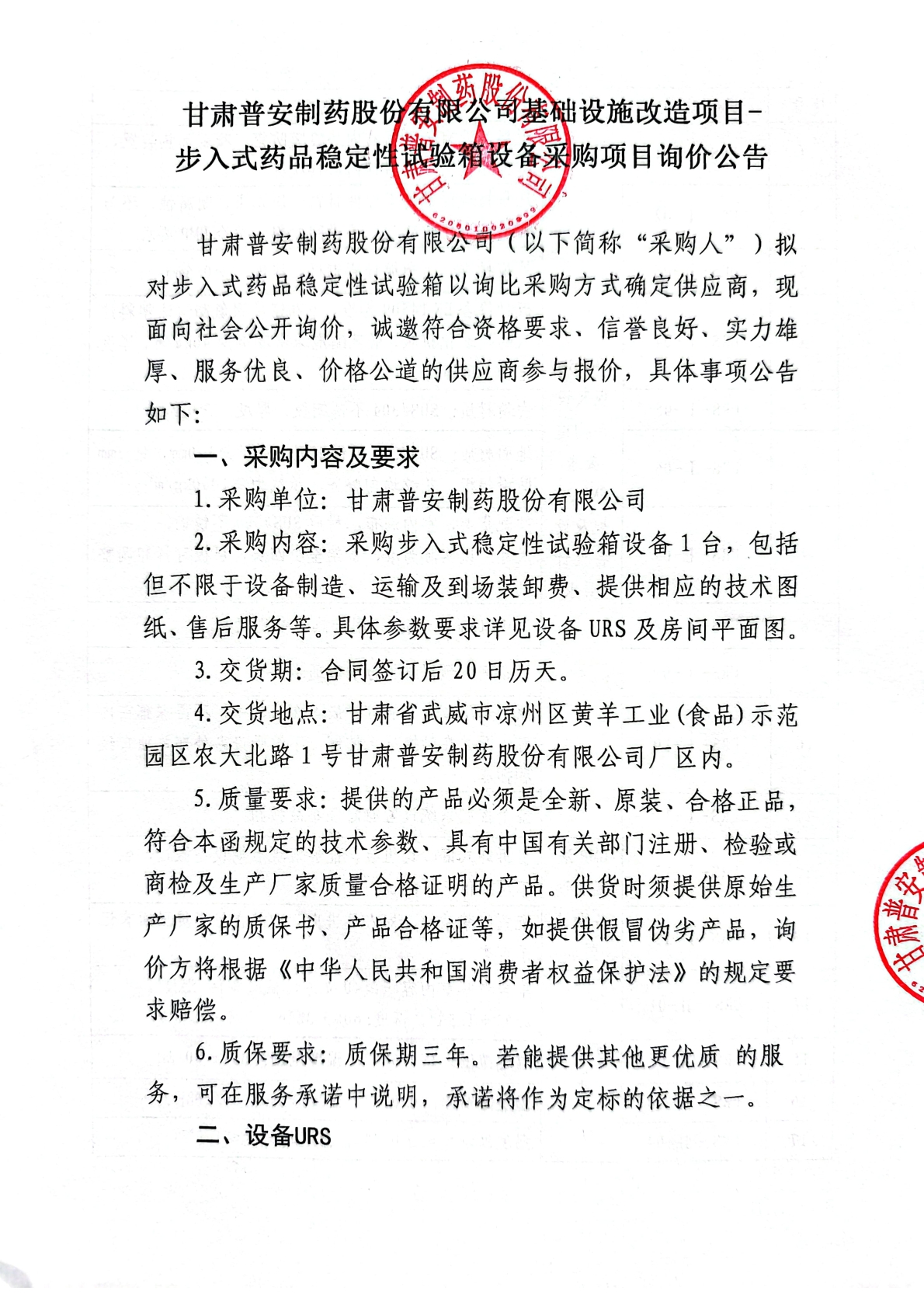 步入式藥品穩(wěn)定性試驗箱設(shè)備采購項目詢價公告