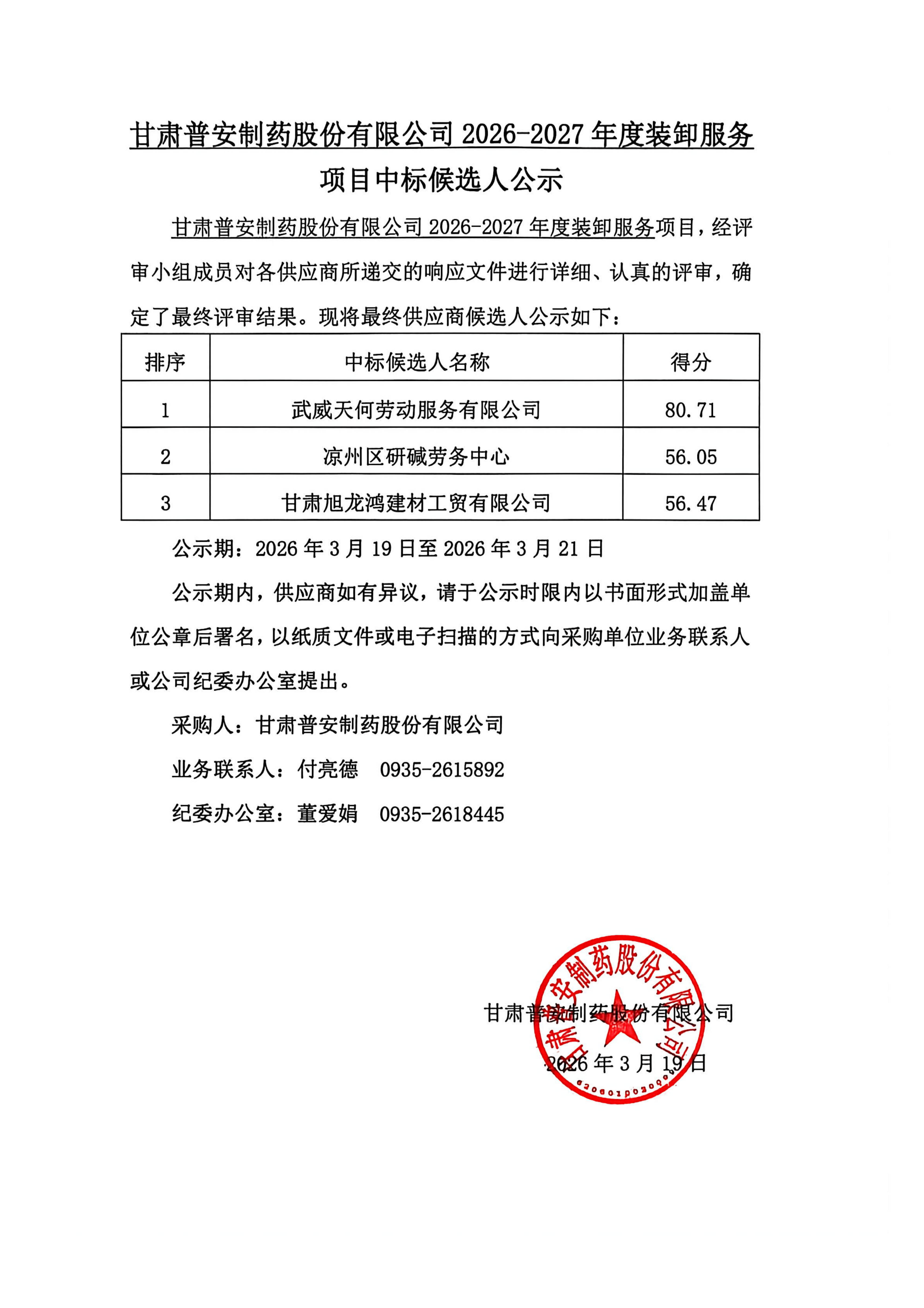 甘肅普安制藥股份有限公司2026-2027年度裝卸服務(wù)項(xiàng)目中標(biāo)候選人公示